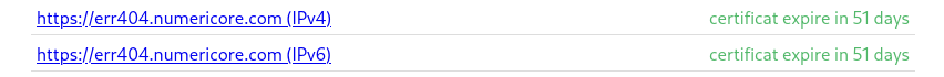 http4, 200, https://err404.numericore.com (IPv4), https://err404.numericore.com http6, 200, https://err404.numericore.com (IPv6), https://err404.numericore.com http4, 200, https://wow.err404.numericore.com (IPv4), https://wow.err404.numericore.com http6, 200, https://wow.err404.numericore.com (IPv6), https://wow.err404.numericore.com